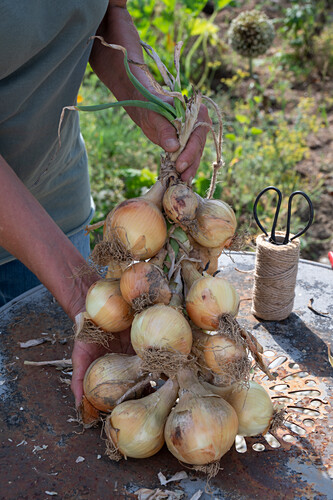 Caption:Woman weaves onion plait from 'Stuttgarter Riese'